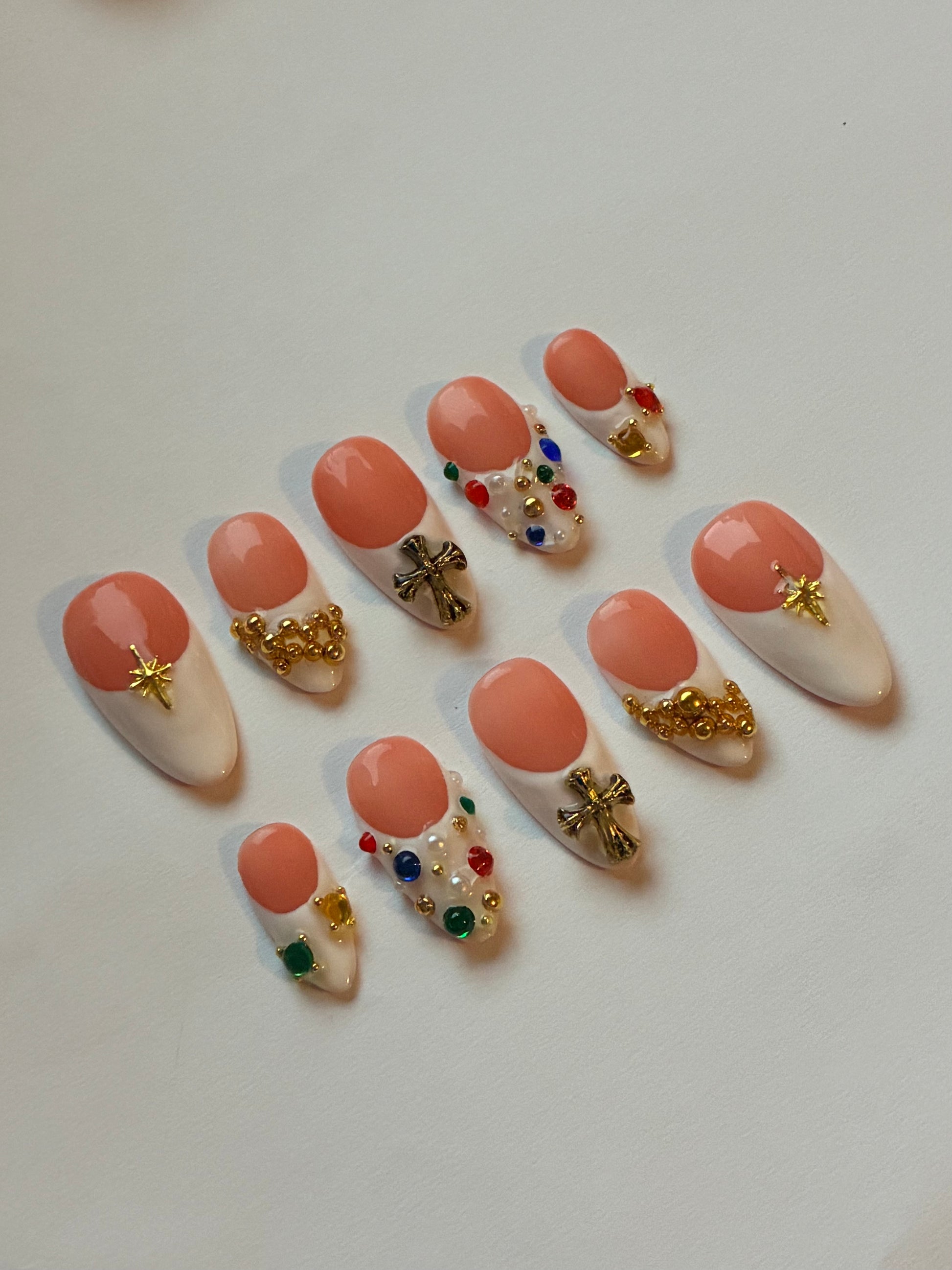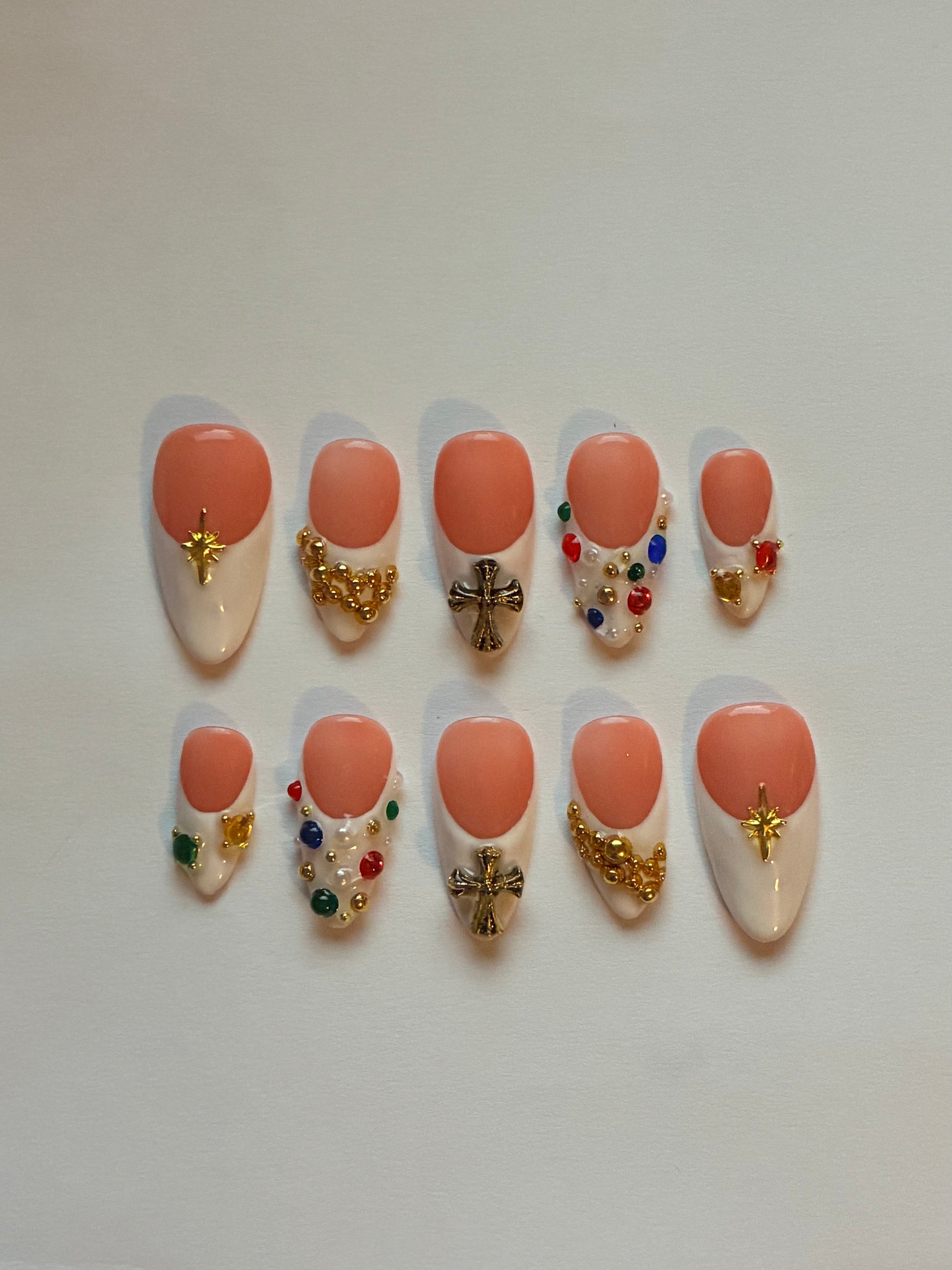 The image is of nail length "Medium Almond". Some charms may be sliiightly different on occasion but still keep the same overall aesthetic.