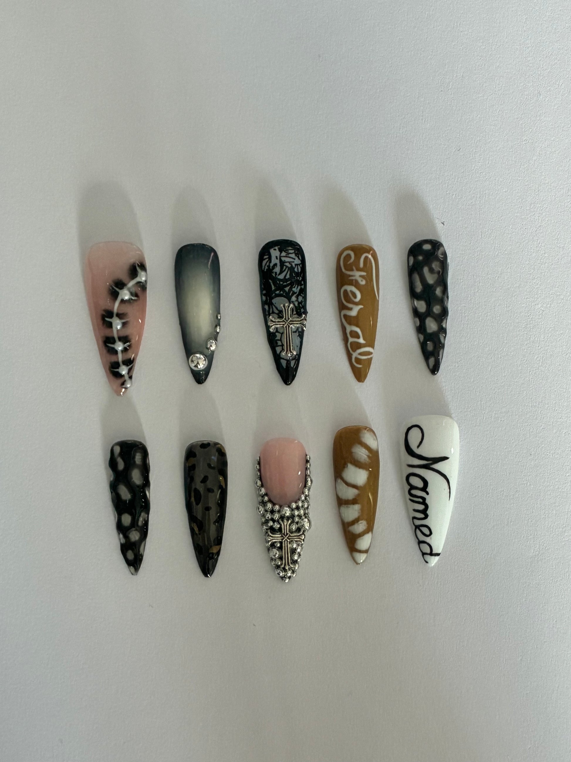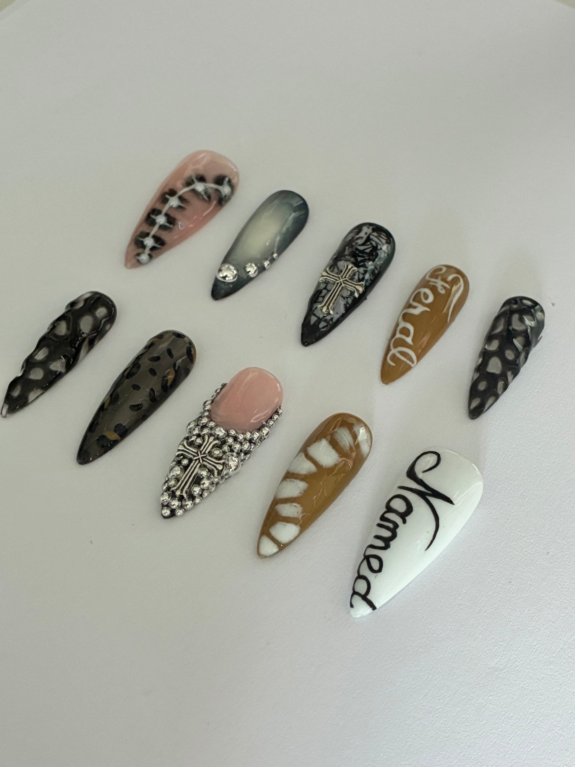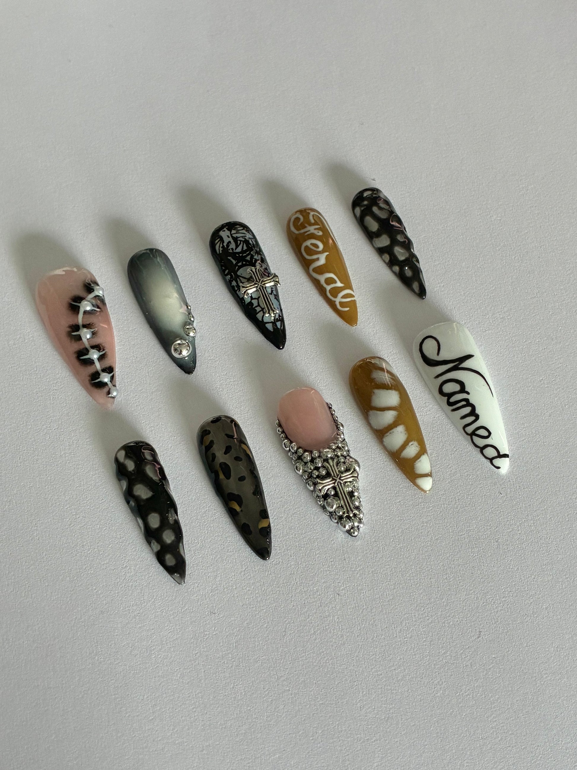 The image is of nail length "Long Stiletto ". Some charms may be sliiightly different on occasion but still keep the same overall aesthetic.