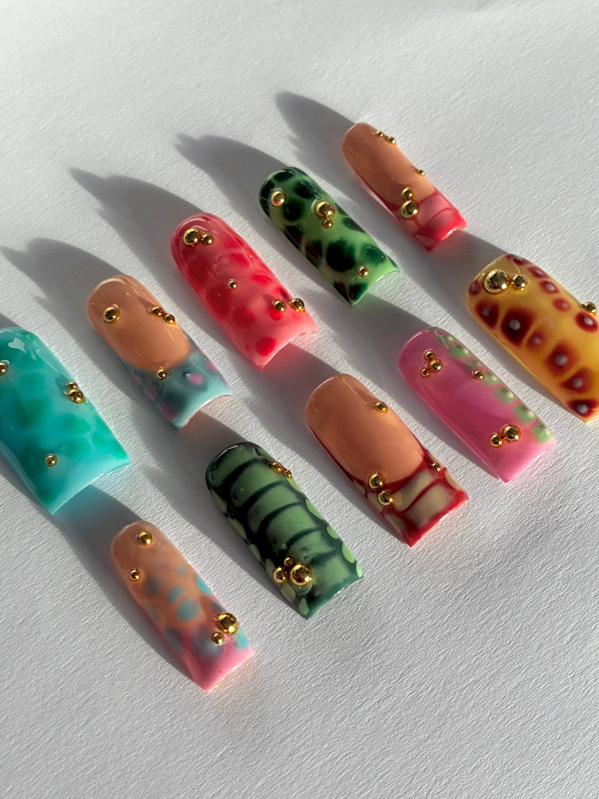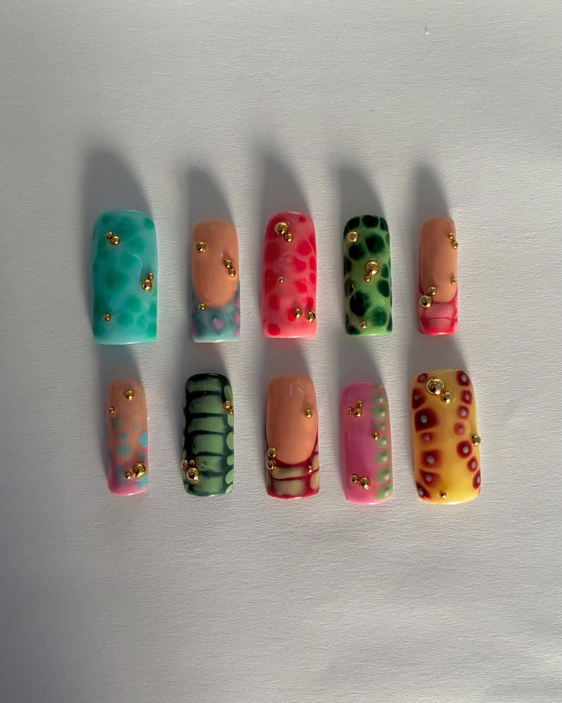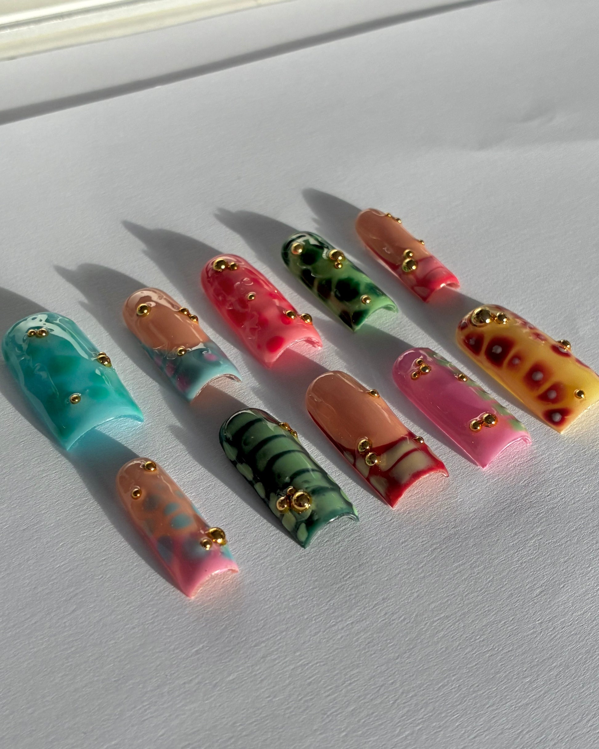 The image is of nail length "Long Square". Some charms may be sliiightly different on occasion but still keep the same overall aesthetic.