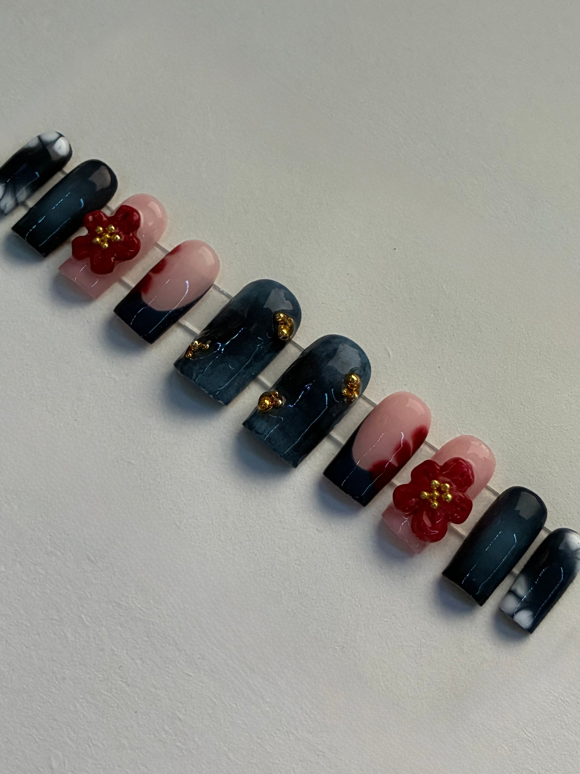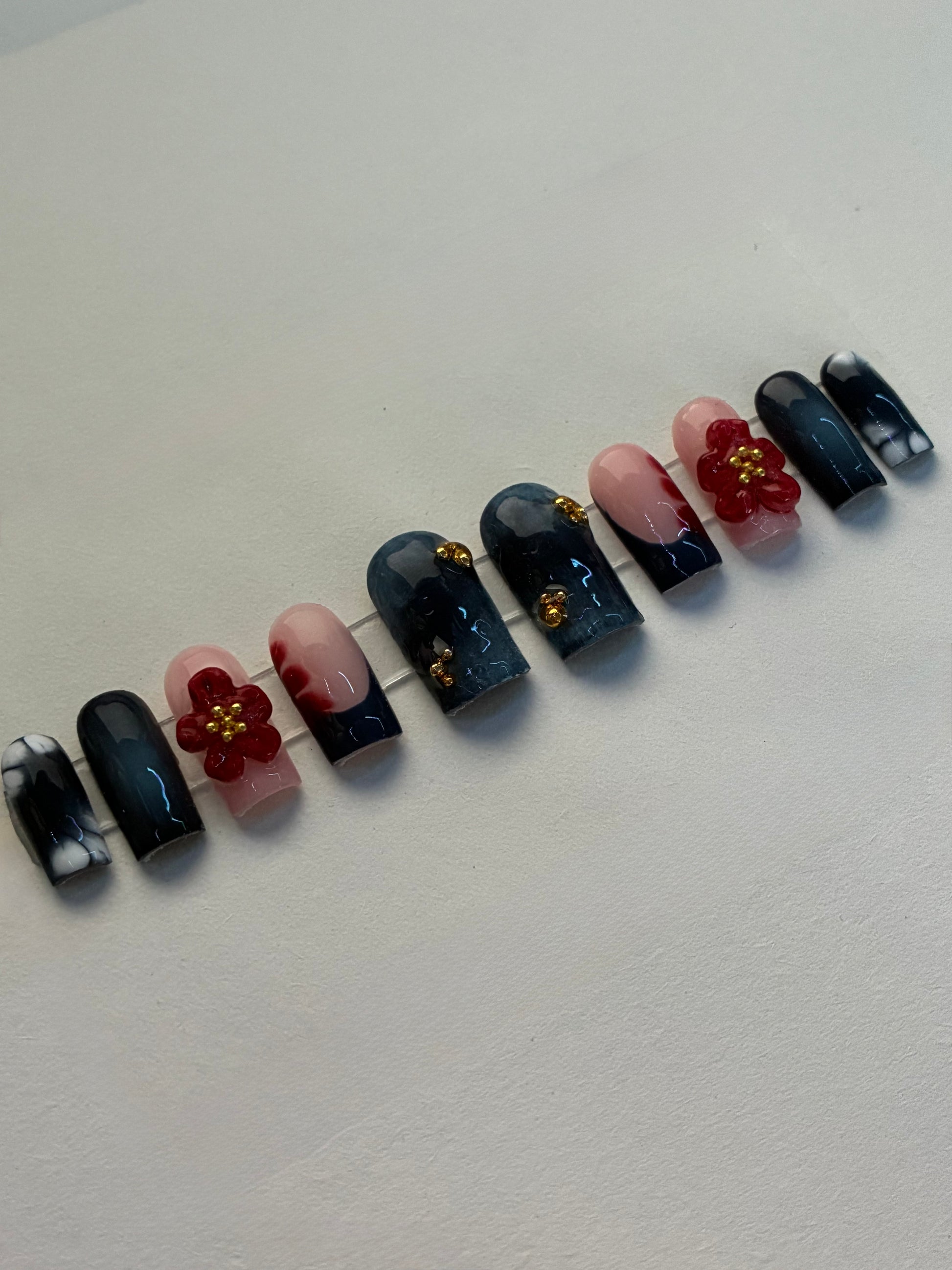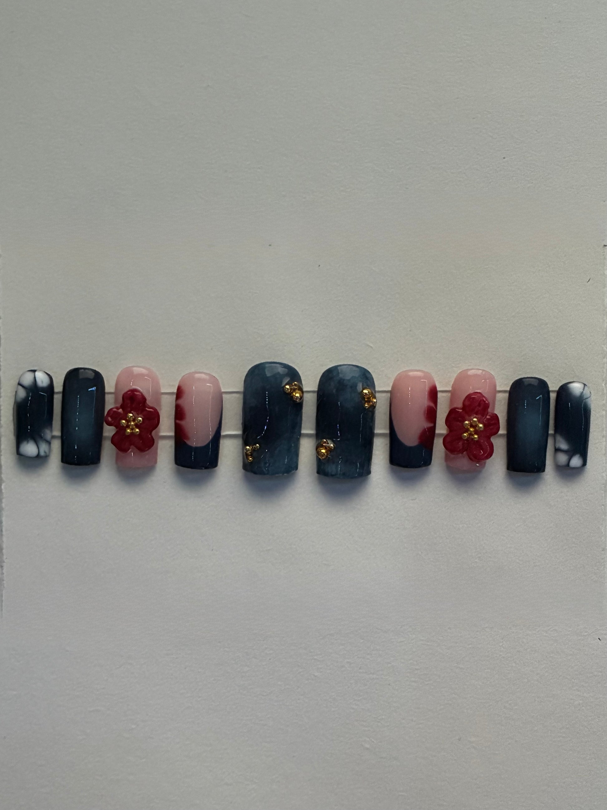 The image is of nail length "Medium square". Some charms may be sliiightly different on occasion but still keep the same overall aesthetic.